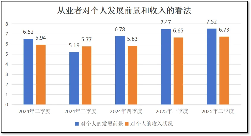 此外,在本次统计调查中,检验检测从业者们对“本人在业内的发展前景信心”这一指标打出的分值为7.52分,也是五季度以来的最高分,但比同期从业者们对检验检测行业整体的发展信心值8.05分要低,这说明从业者们尽管认为行业会向好发展,但由于近年来极度内卷的国内就业市场,对自身发展的乐观情绪还有限。而对于个人的收入状况满意度的这一指标的看法,2025年一季度末得分为6.73分,也是五季度以来的最高分,说明随着对行业发展预期的提升,从业者们认为自身的收入状况也会水涨船高。