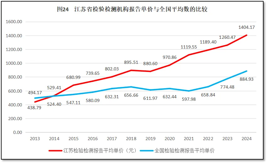 由图24可见,从2014年起,江苏省检验检测报告单价开始超过全国平均数,并持续拉大两者的差距。到目前,江苏省检验检测报告单价达到1404.17元,是全国平均数884.93元的1.59倍,排名全国第5位,较2023年的排名下降3位。由此可见,尽管江苏省检验检测机构对外出具的报告数量不多,但报告单价高,相对而言附加值也高,检验检测机构可以通过数量相对较小的检验检测业务,即可保持机构的正常运行和必要的利润。