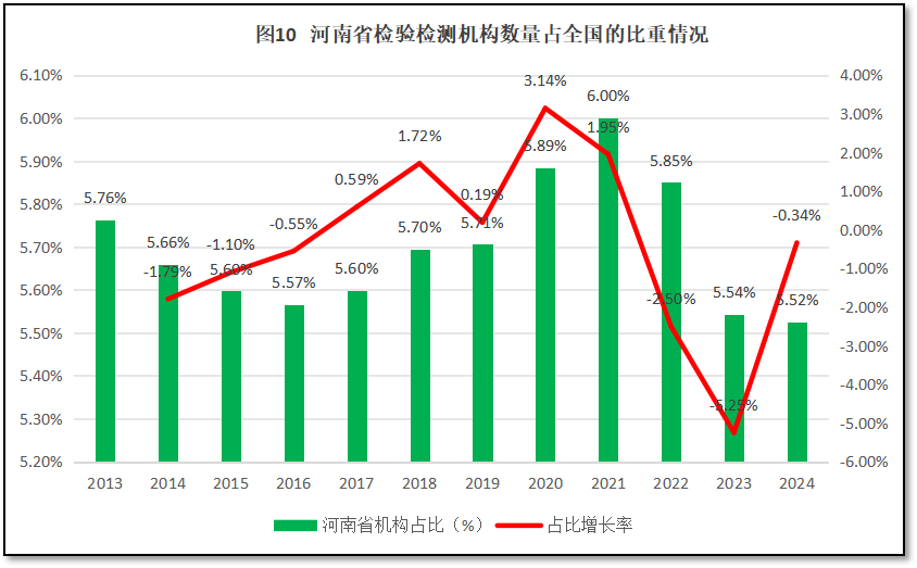 截至2024年末,河南省检验检测机构数量为2931家,约占全国检验检测机构数量的5.52%,排名全国第4。过去12年河南省检验检测机构数量在全国检验检测行业中的占比以及占比的增长率,如图10所示。