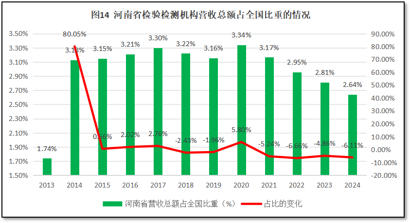 由图14可见,河南省检验检测机构营收总额在全国检验检测行业营收总额中的比重总体来看稳中有降,占比最高出现在2020年,一度达到3.34%。最近几年持续下降,2024年度占比降到2.64%,是除2013年之后最低的一年。