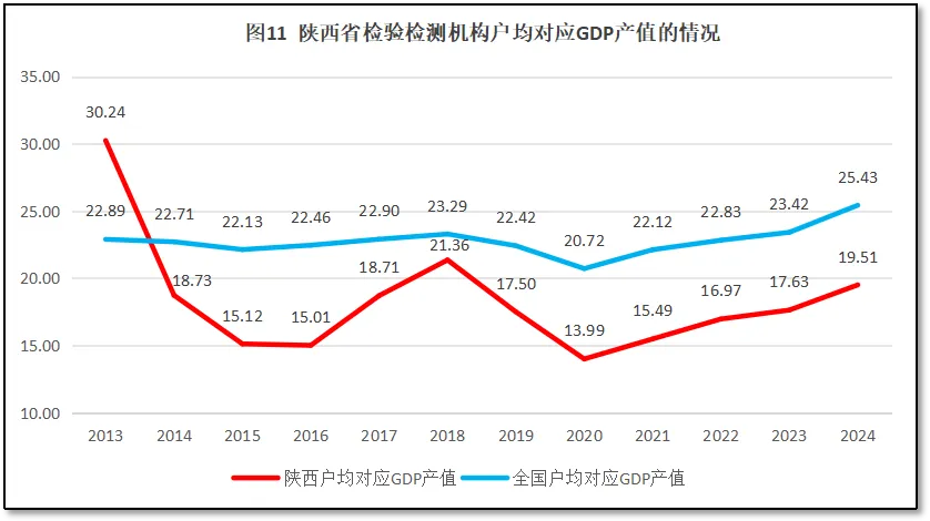 由图11可见,过去12年,陕西省检验检测机构户均对应的GDP值起伏较大,呈现一个W型的变化,在2013年是30.24亿元的高值,此后逐步降低到2016年的15.01亿元;在2018年增长到21.36亿元,又开始下降,到2020年降到13.99亿元。最近几年有所回升,2024年度达到了19.51亿元。从陕西省户均对应GDP的值与全国情况进行比较可见,陕西省的数值除了2013年之外都低于全国平均数,最近几年两者的差距也保持在6亿元左右,没有太大变化。陕西省的数据变化趋势表明,相对陕西省经济总量而言,陕西省检验检测机构数量相对一直较多,与当地发展需求相比显得过剩,但过剩的情况不算严重,总体保持一种较为平稳的发展状态。此外,陕西省检验检测行业中当地经济版图中的地位不太高,近年来虽然缓慢提升,但仍距离全国普遍的情况有一定差距。