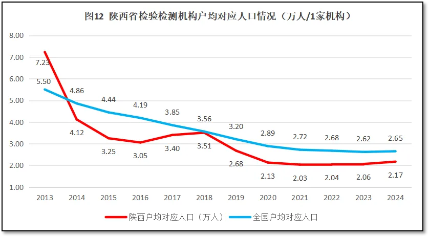 再来看陕西地区检验检测机构户均对应服务的人口情况。2024年末,陕西省常住人口3953万人,检验检测机构户均服务人口2.17万人,比全国平均数2.65万人低了4800人,排名全国第20位,较2023年度排名提升了4位。过去12年陕西省检验检测机构户均对应的人口数量与全国的情况进行比较,如图12所示。