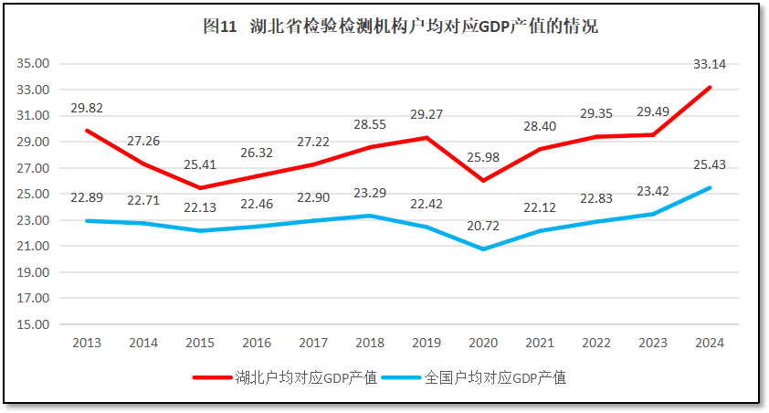 由图11可见,过去12年,湖北省检验检测机构户均对应的GDP值呈现一个先降后升的类似W型的变化,在2013年、2019年先后有两次峰值,但随后的2015年和2020年又有较大降幅。2020年以来湖北省检验检测机构户均对应GDP值逐年提升,2024年度达到33.14亿元,是12年来的最高值。从湖北省户均对应GDP的值与全国情况进行比较可见,湖北省的数值一直比全国平均数要高,2024年度还拉大了与全国平均数的差距。湖北省的数据变化趋势表明,相对湖北省经济总量而言,湖北省检验检测机构数量不算多,与当地发展需求相比较为适宜,检验检测行业还有较大增长空间。
