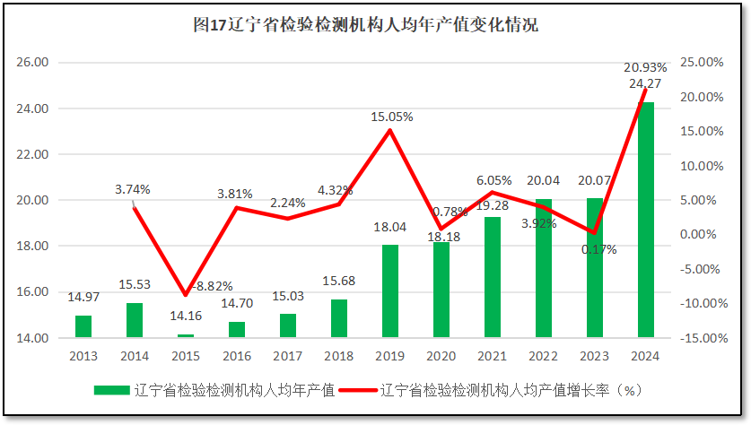 由图17可见,12年来,辽宁省检验检测机构人均年产值总体保持增长,其中在2019年出现过15.05%的增长高峰,人均年产值也从15万元左右跃升到18万元左右。但此后几年增幅不大,直到2024年才又出现了20.93%的又一次增长高峰,人均年产值也达到了24.27万元,创下历史新高。
